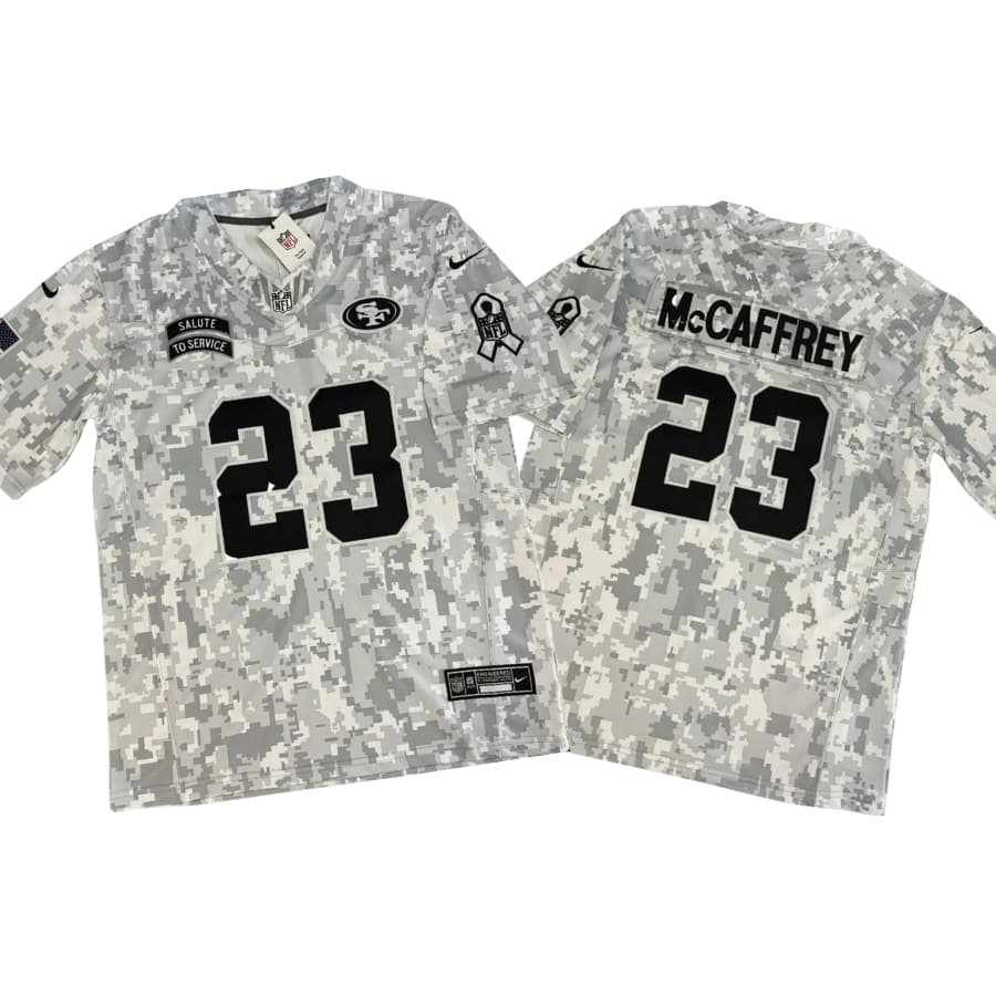 Honor your favorite gridiron star and our nation’s service members with the Christian McCaffrey #23 San Francisco 49ers Salute to Service Arctic Vapor Jersey. This elite commemorative piece features a striking bone-white camouflage aesthetic paired with team graphics. Engineered for durability and premium comfort, the jersey boasts fully stitched name, numbers, and patches, including the iconic American flag and ribbon emblem. The breathable mesh construction and athletic fit make it perfect for game days or casual wear. Support the troops while representing a legendary playmaker in this high-quality, weather-inspired tribute to football and bravery.